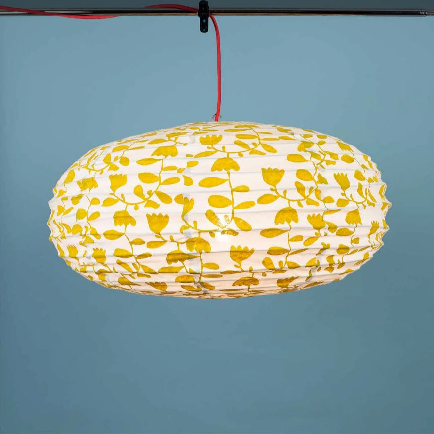 En lampskärm i bomull med fin oval form. Den ger ett mjukt ljus och kan användas var som helst i hemmet. Mönstren är tryckta med handsnidade träblock på bomull.