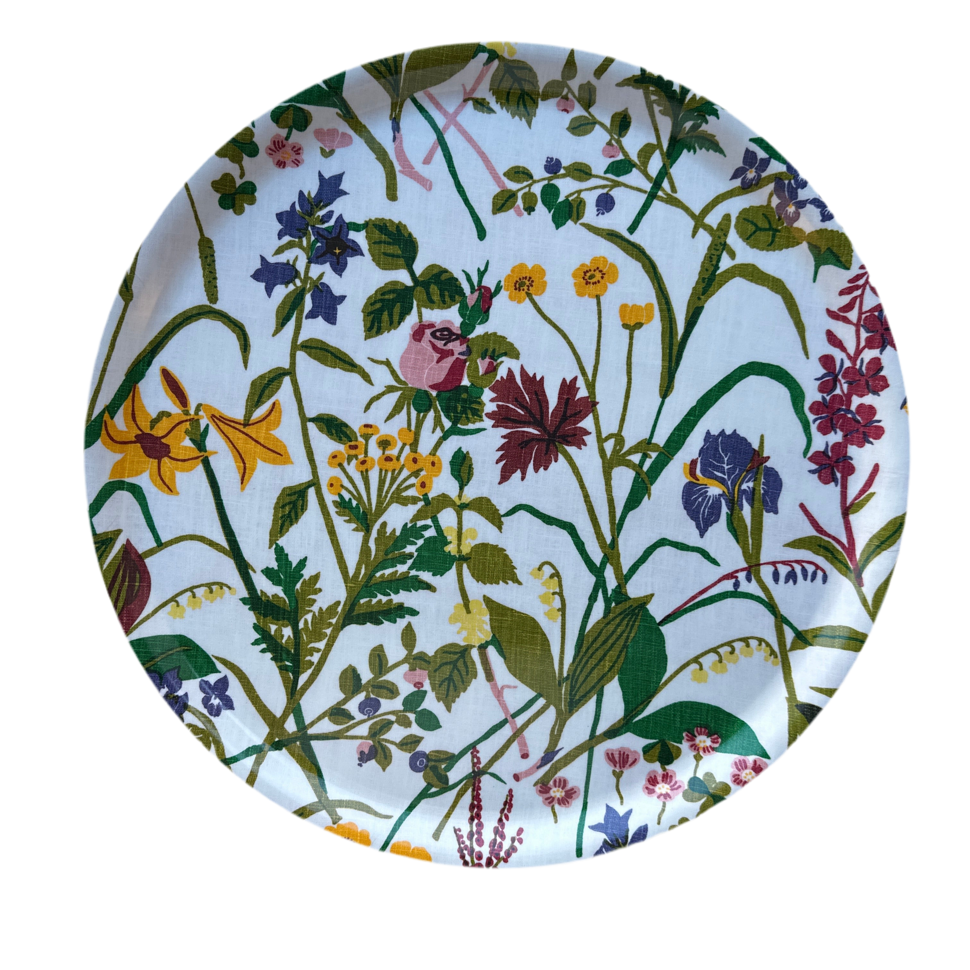 Digitaltryckt bricka 46 cm i mönster Ros och lilja 1946 av Gocken Jobs. Framtaget av Frösö handtryck (tillverkad i Småland i björkfanér).