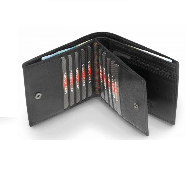 Plånboken har två sedelfack, myntfack med dragkedja, 14 kortfack och 3 öppna fack för kvitton eller extrakort.