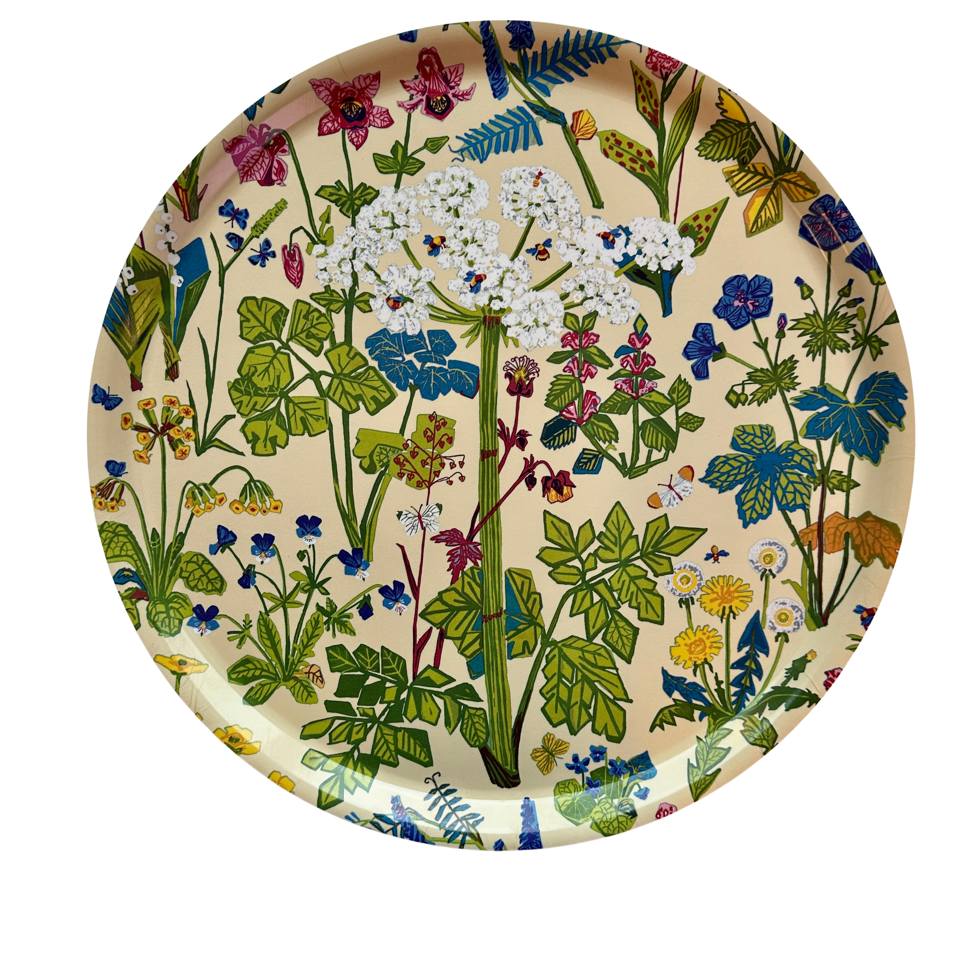 Digitaltryckt bricka 46 cm i mönster Aurora 1956 av Lisbet Jobs. Framtaget exklusivt för Vandalorum (tillverkad i Småland i björkfanér).