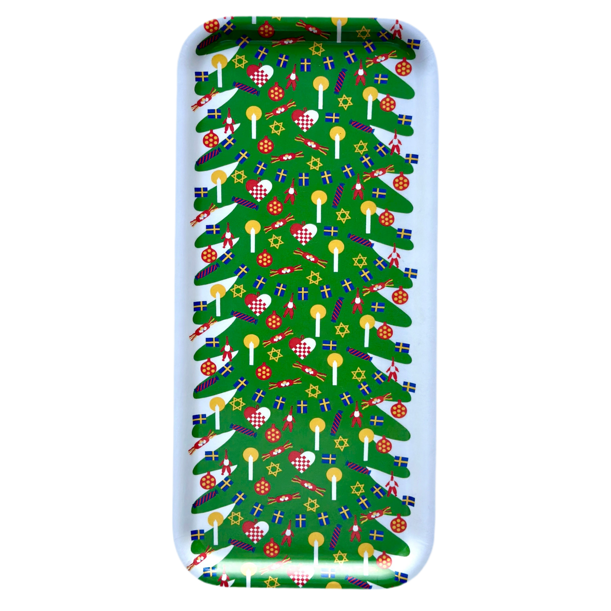 Bricka 32*15 cm i mönster Julegran (1974) av Wanja Djanaieff . Framtaget exklusivt för Vandalorum (tillverkad i Småland i björkfanér).