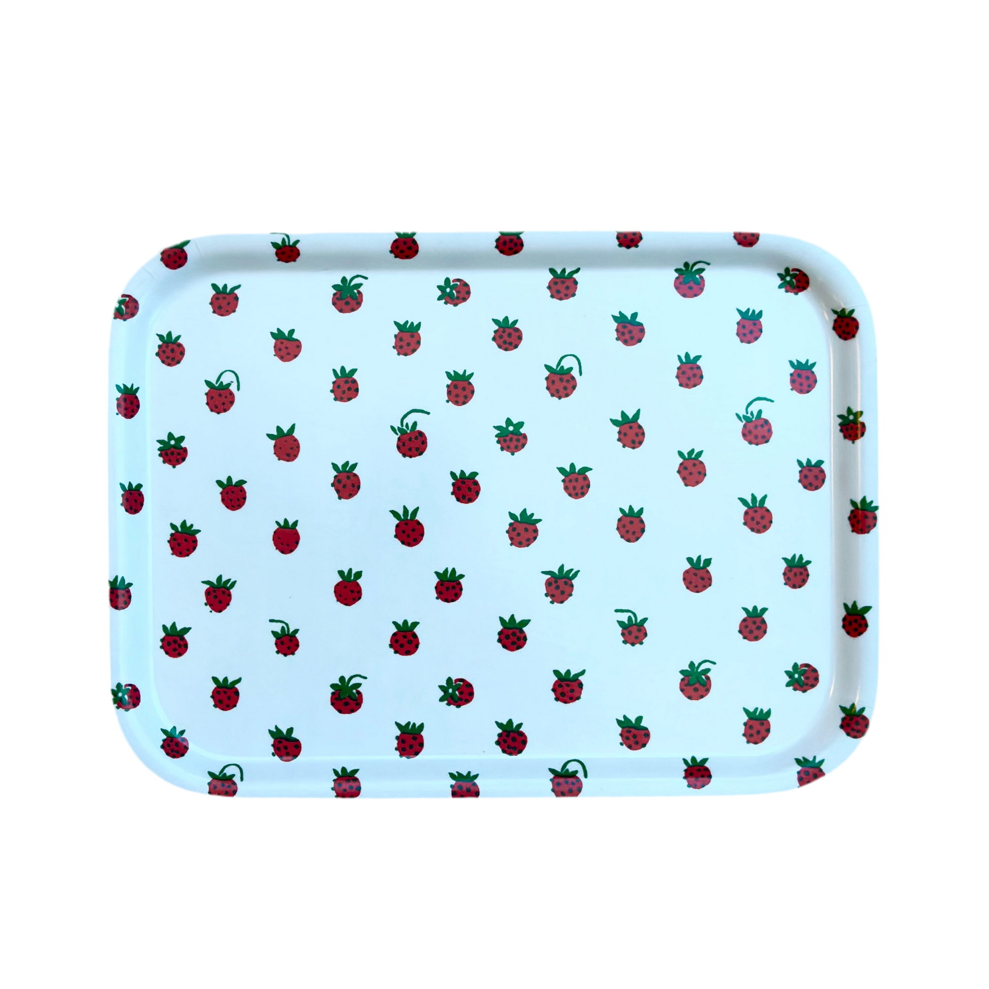 Bricka 27*20 cm i mönster Smultron (1957) av Gocken Jobs. Framtaget exklusivt för Vandalorum (tillverkad i Småland i björkfanér).
