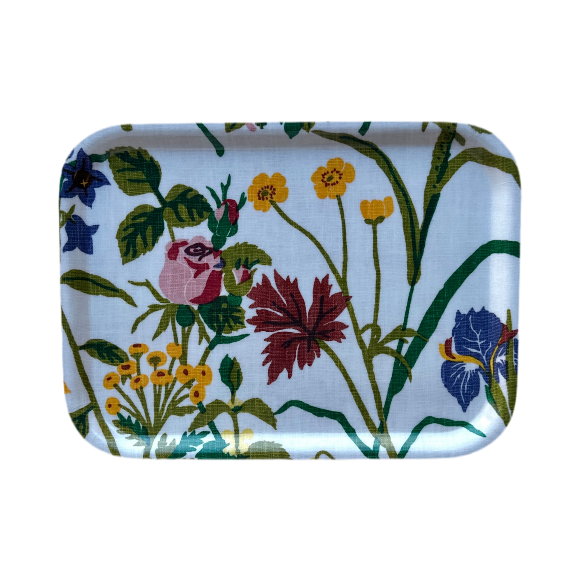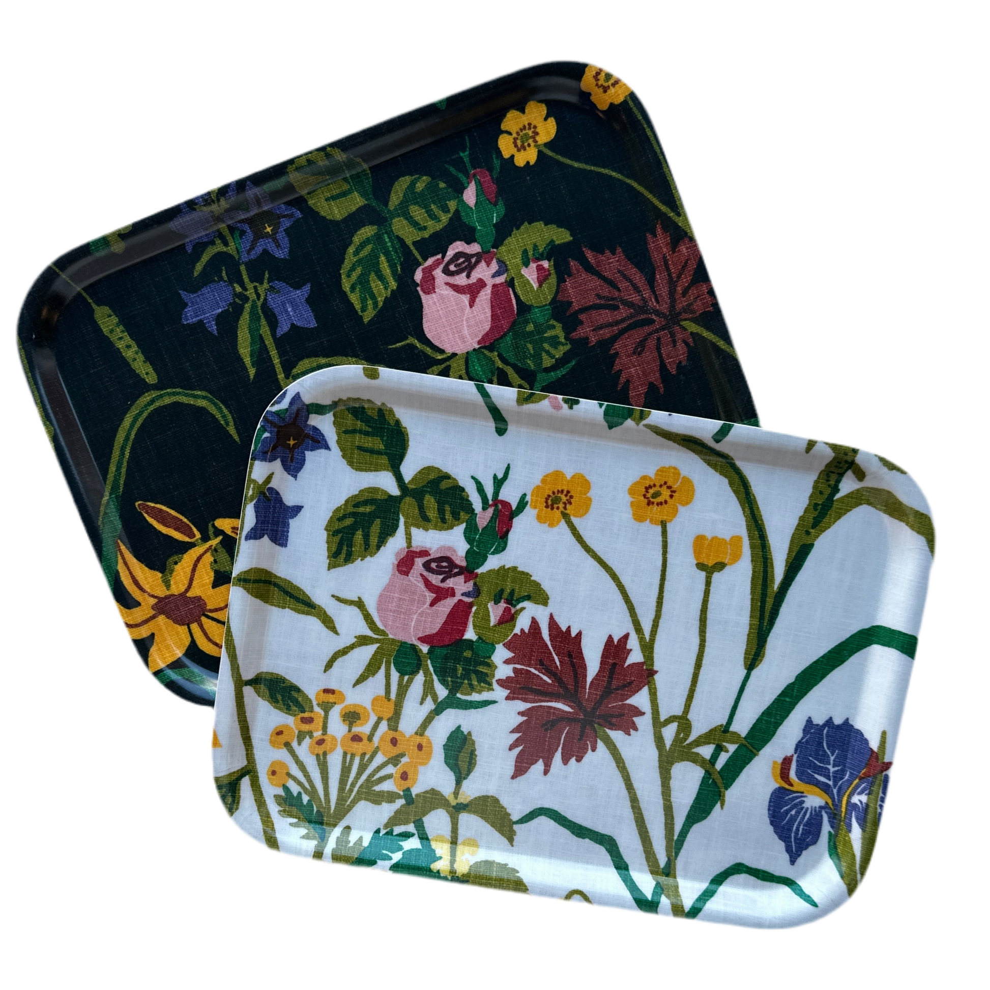 Digitaltryckt bricka 27 cx 20 cm i mönster Ros och lilja 1946 av Gocken Jobs. Framtaget av Frösö handtryck (tillverkad i Småland i björkfanér).