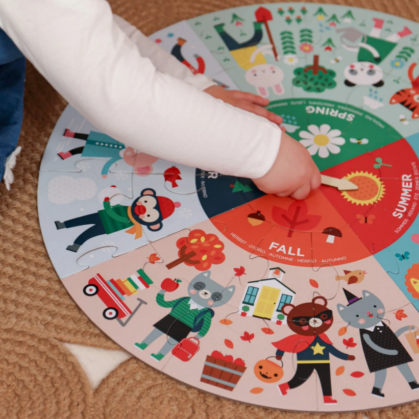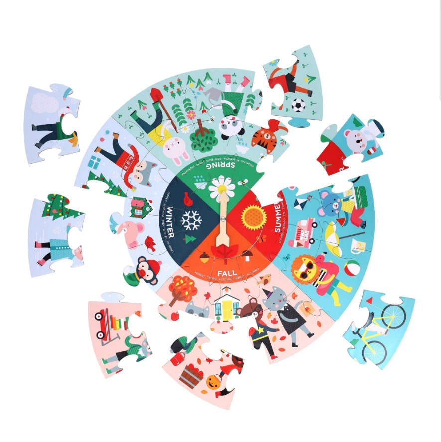 Att lära sig årstiderna har aldrig varit så roligt! Kan du hitta en kanin som planterar frön? Eller en koala som njuter av en isglass? Kanske ser du fallande löv eller en rödhake som ser glad ut? Sätt ihop bilden av ett år med djur som har kul på vintern, våren, sommaren och hösten! När pusslet är klart kan du ställa in de rörliga händerna på olika årstider och ha roligt när du funderar på vilka rutiner eller aktiviteter du gör under den tiden på året.