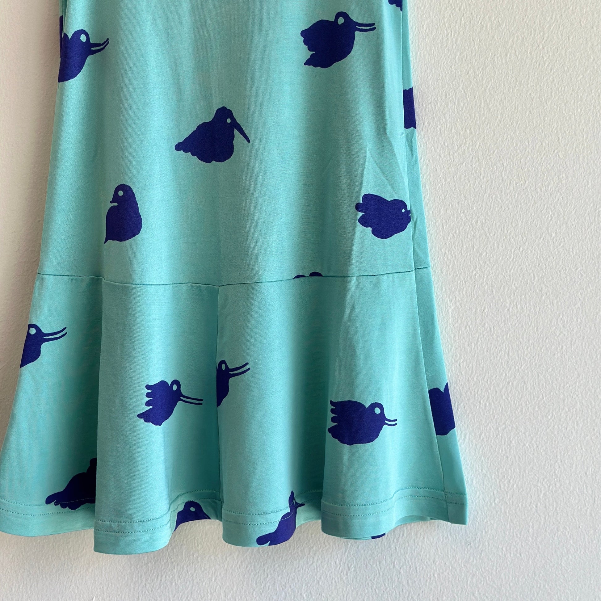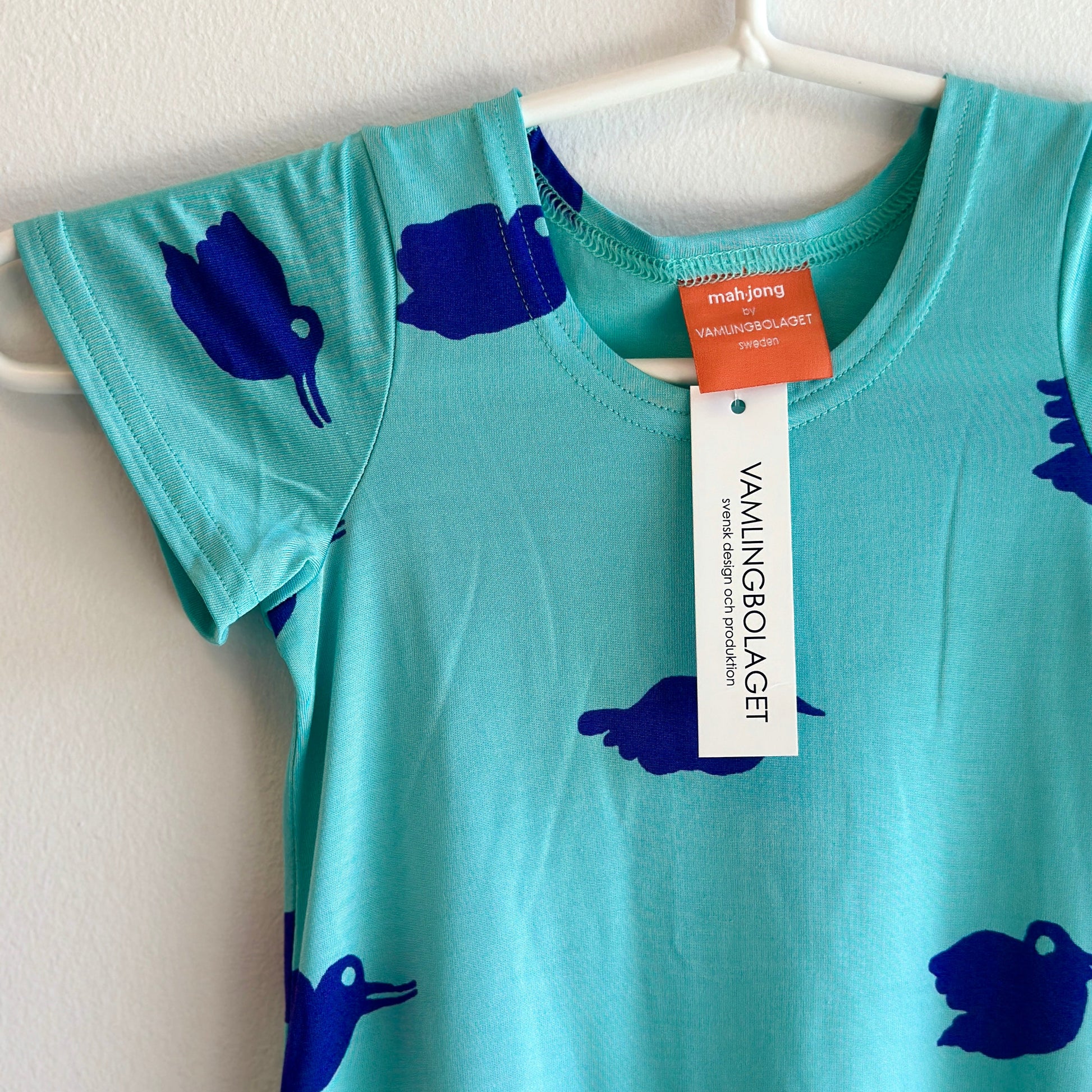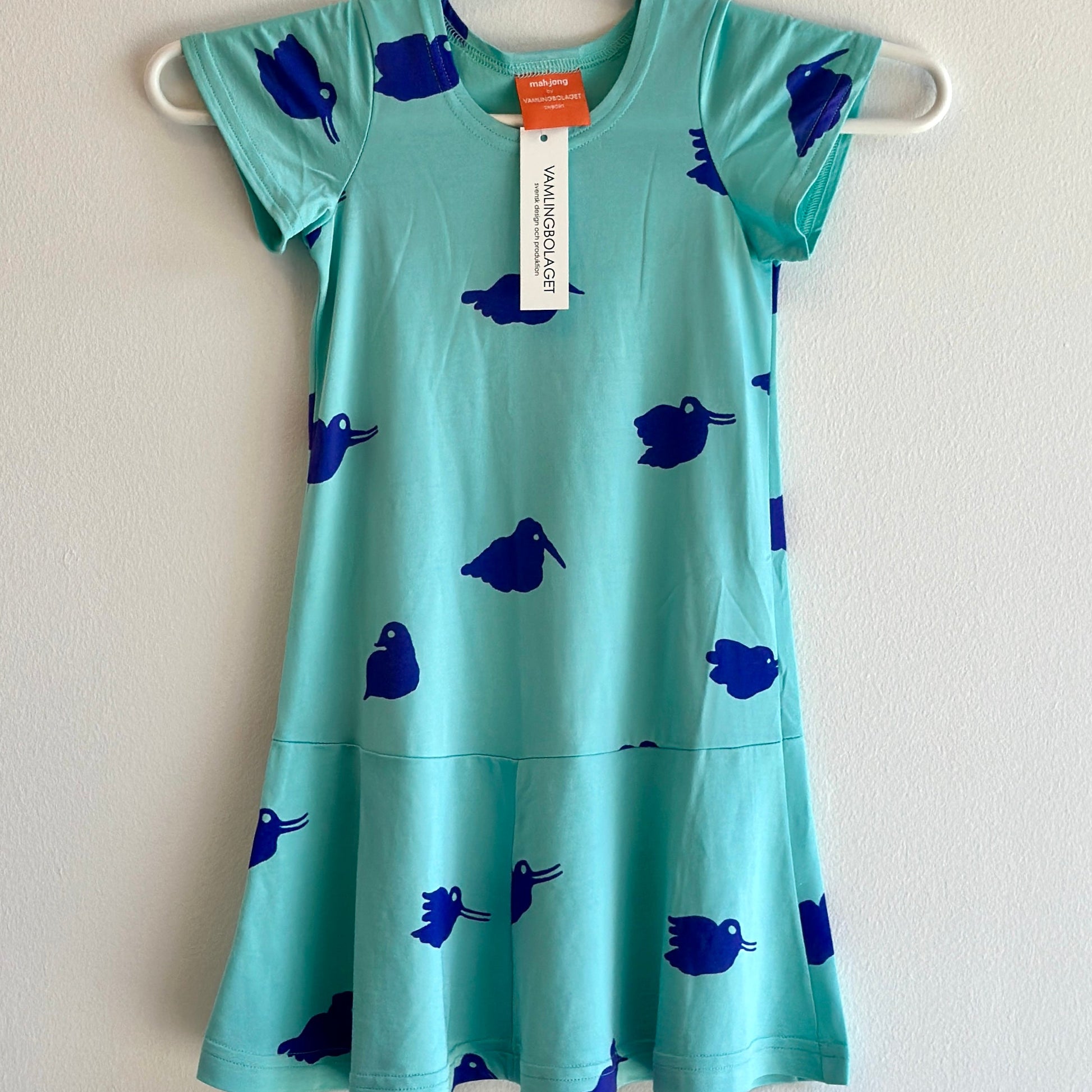 Vingklänning med korta vingärmar och volang i kjolen. Längd från axel till nederkant: stl 100 cl 57 cm, 110 cl 66 cm, 120 cl 73 cm, 130 cl 84 cm.