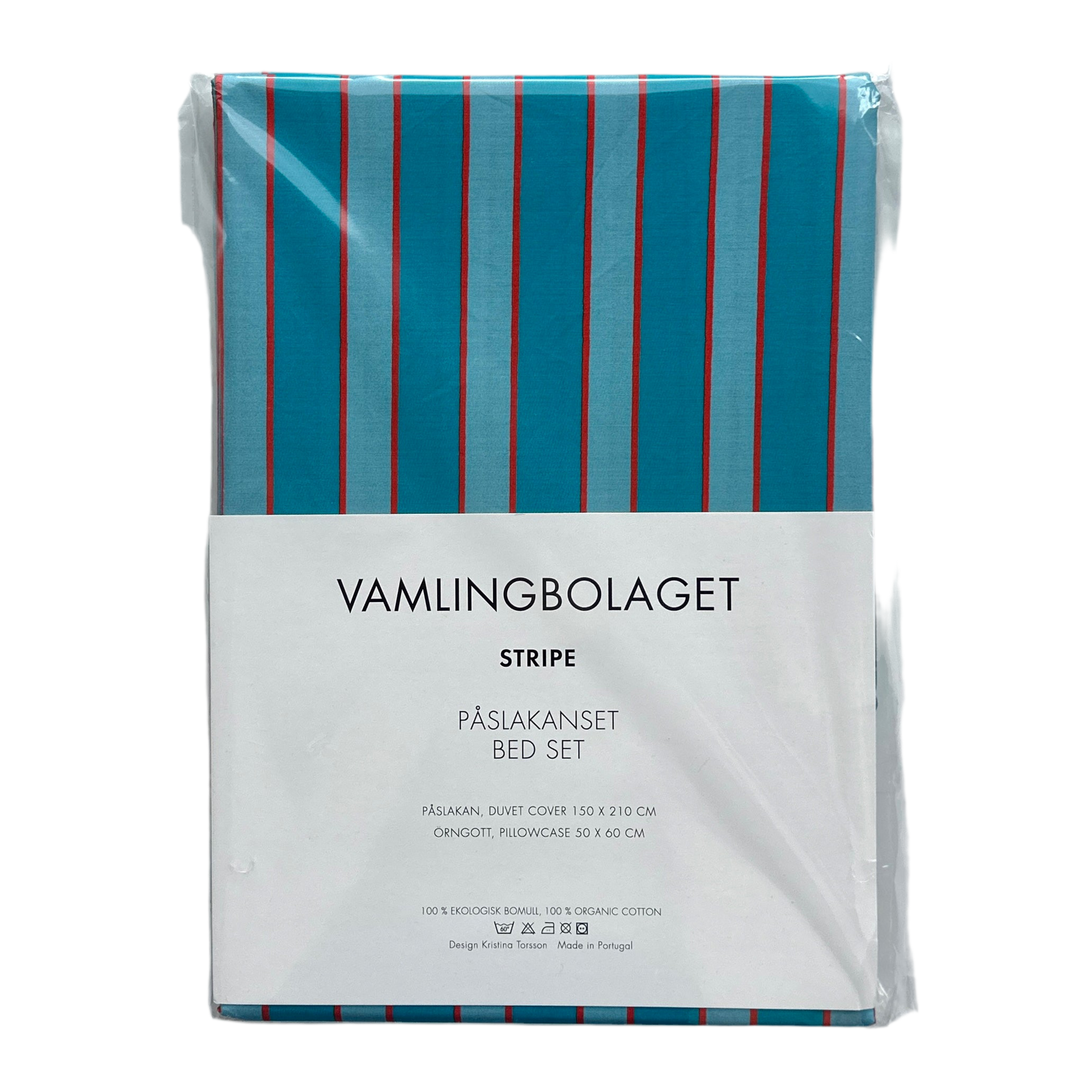 Sängsetet inkluderar ett påslakan (210 x 150 cm) och ett örngott (50 x 60 cm). Det är tillverkat av ekologisk bomull som vävts och tryckts i Portugal med vårt nya mönster Stripe i turkos, ljusgrått och orange. Tyget har en ljuvligt mjuk och behaglig känsla!