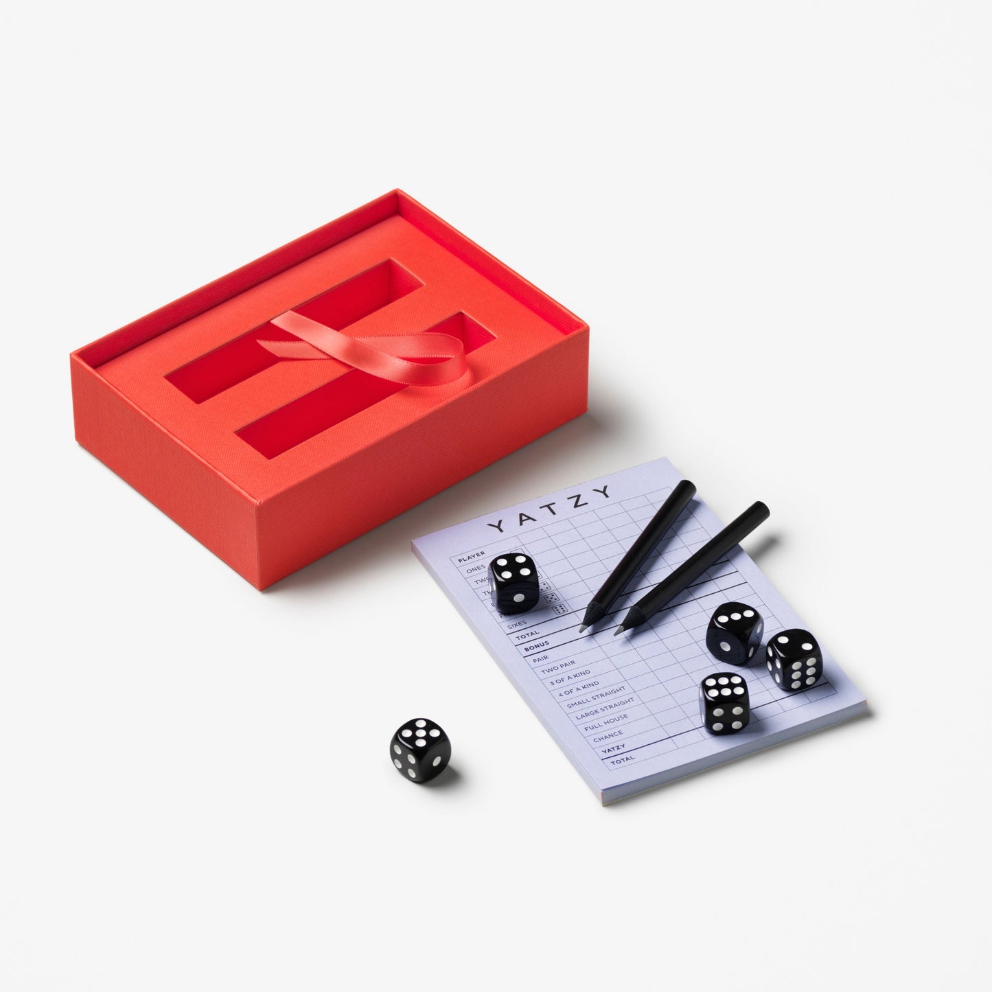 Yatzy med en modern twist – där stilren design möter klassisk spelglädje. Setet innehåller fem svarta tärningar, två svarta pennor och ett poängblock med 50 sidor. Med tydliga instruktioner på engelska, franska och tyska passar spelet upp till 6 spelare från 4 år och uppåt.